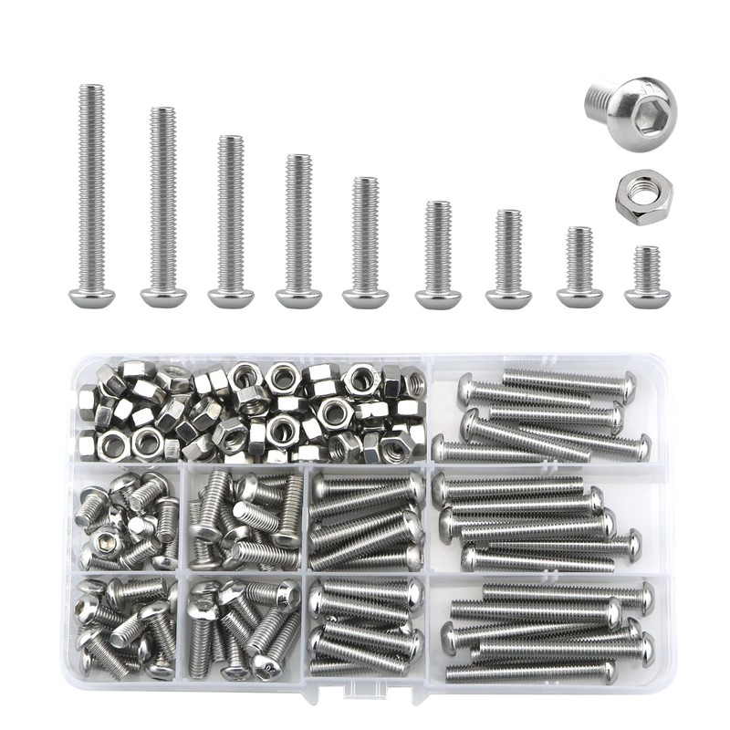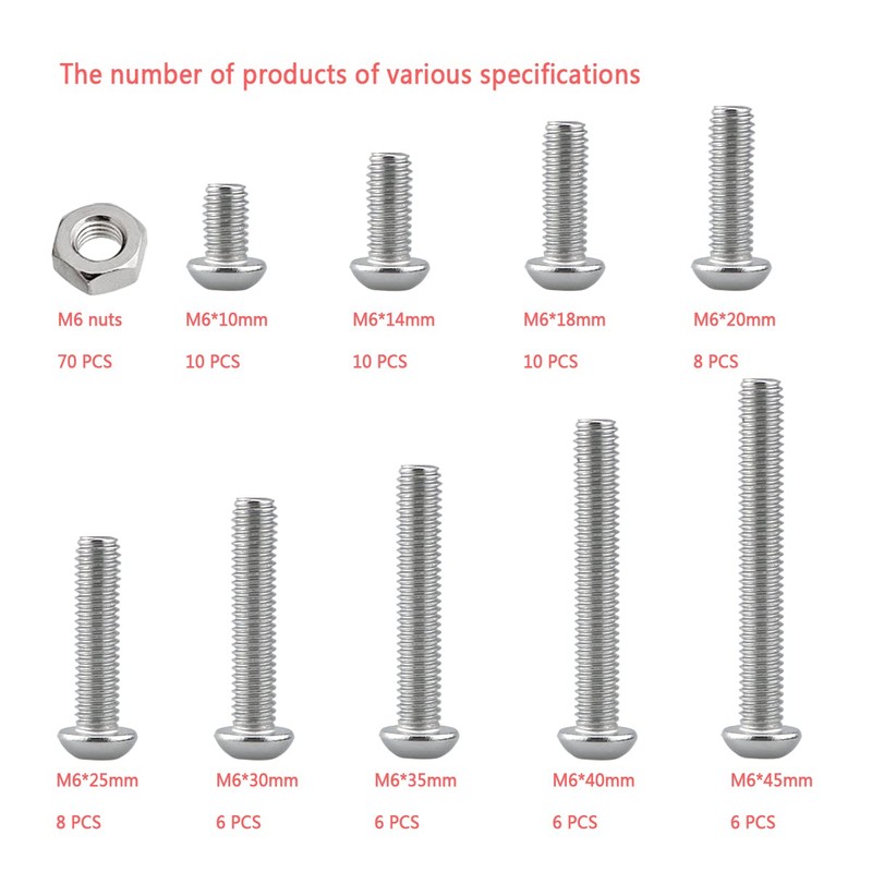 • The set includes: 10 pieces M6 x 10 mm, 10 pieces M6 x 14 mm, 10 pieces M6 x 18 mm, 8 pieces M6 x 20 mm, 8 pieces M6 x 25 mm, 6 pieces M6 x 30 mm, 6 pieces M6 x 35 mm, 6 pieces M6 x 4 0 mm, 6 Pieces M6 x 45 mm, 70 pieces matching M6 nuts, total 140 pieces M6 Allen screws and nut set