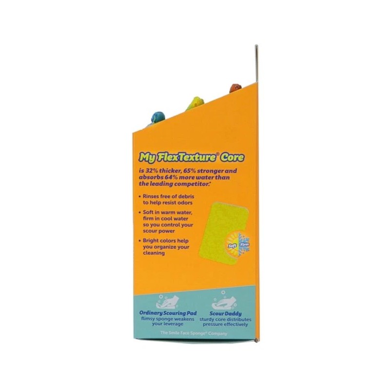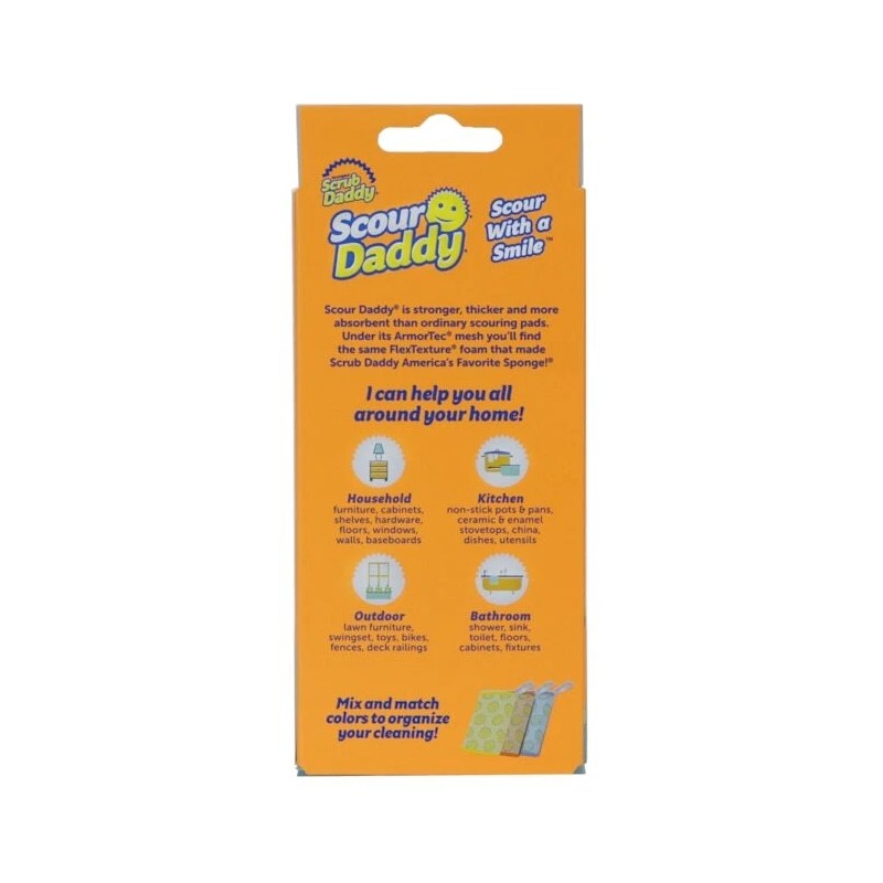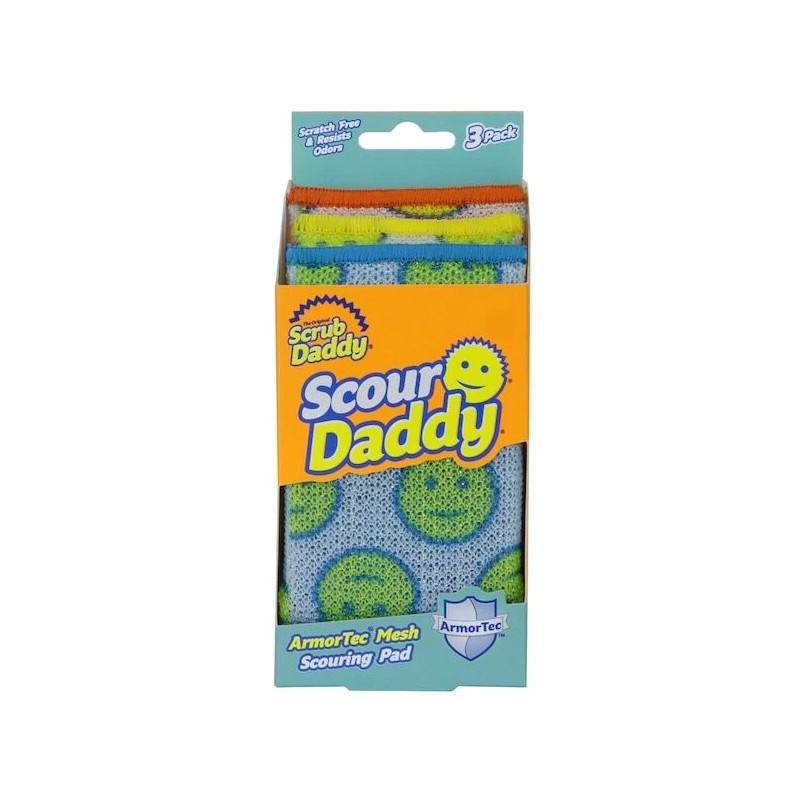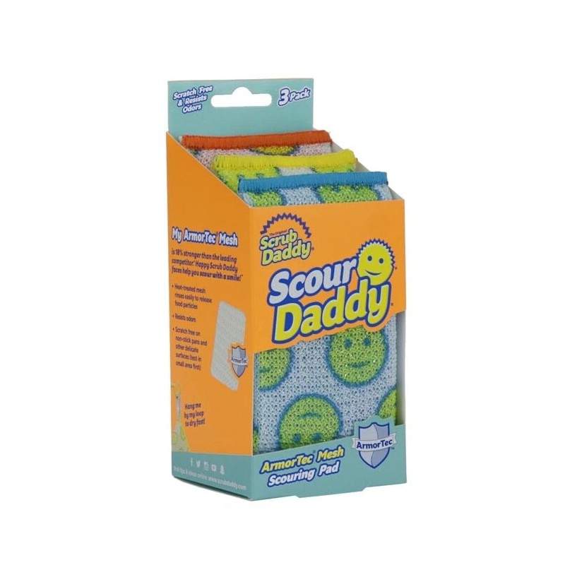 One 3-Count Pack ArmorTec Mesh Scouring Pad. Mesh 18% stronger; FlexTexture Core 32% thicker; 65% stronger and absorbs 64% more water than the leading competitor. Ideal for use all around the home - Kitchen; Bathroom; Outdoor and a multitude of other uses in the household. Mesh is scratch free on non-stick pans and other delicate surfaces (test in small area first). Flex-Texture Core rinses free of debris to help resist odors. Soft in warm water, firm in cool water so you control your scour power. Bright colors help you organize your cleaning. Try Scour Daddy and youll never buy another flimsy scouring pad. With Flex Texture material sealed in Armor Tec mesh its thicker stronger and sturdier than competing products. Grab a handful of scour power that never leaves a scratch!