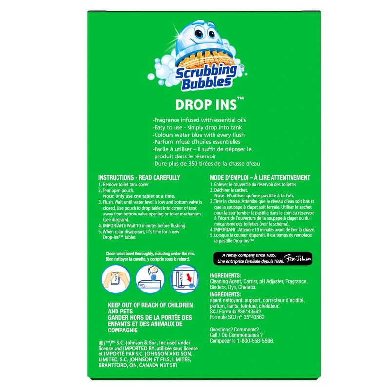 Scrubbing Bubbles Drop-Ins are just the remedy for yucky toilet stains. Just drop a tablet into your tank to help keep your toilet bowl stain-free up to 5 weeks. With every flush, your toilet enjoys glorious relief from stains caused by hard water, minerals and limescale. Quick and hassle free! Stain and smell protection that drops right in. That's cleaning reinvented.