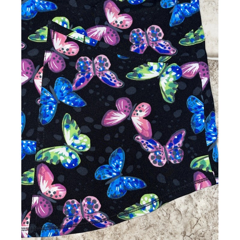 NWT Womens Black Butterfly Print Stretch Scrubstar Scrub Top Shirt Size 3XL. Pink, blue and green butterfly pop print. Pull over v neck short sleeve shirt with 3 lower front pockets. Soft fabric finish. 4 way stretch. Easy care. Shirt measures 28” from pit to pit. Measures 29” from the top at the shoulder to the bottom of the shirt. Very silky soft stretchy material.