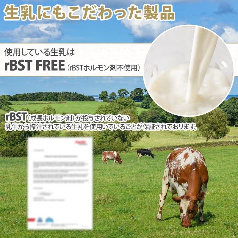 - 【rBST】 rBST (成長ホルモン剤)が投与されていない乳牛から搾汁されている生乳を使用いていることが保証されております。