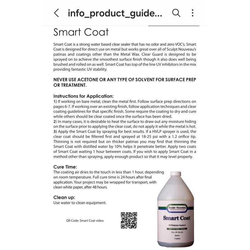 Smart Coat is an easy to use urethane/resin sealant for all metal surfaces. Once dry, it forms a durable top coat that resists UV damage, humidity, abrasion, and corrosion. Smart Coat has zero VOC, no odor, and is non-hazardous. It is terrific over polished metal, rust, and other patina finishes. It does not tend to change the color of a patina unlike solvent clear coats.
