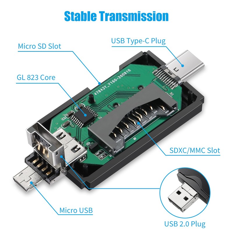 The SD card camera reader with 3 connectors, namely USB 2.0, Micro USB and USB-C connectors, compatible with all USB-C devices, laptops, tablets and Android smartphones that support OTG function. Dual card slot of the memory card adapter supports SD SD-3C SDXC SDHC MMC RS-MMC TF Micro SDXC Micro SD Micro SDHC card and UHS-I memory cards. (Note: Micro USB is included in USB-A)