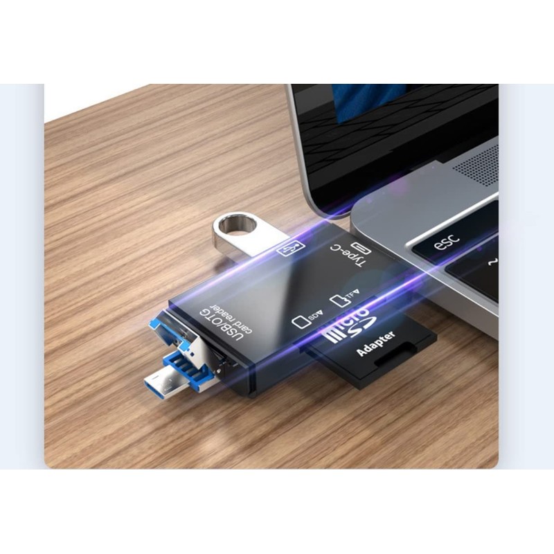 • 5-in-1, 3 interfaces: USB 2.0, USB-C 3.1 Type C, MicroUSB and 2 ports: microSD, SD