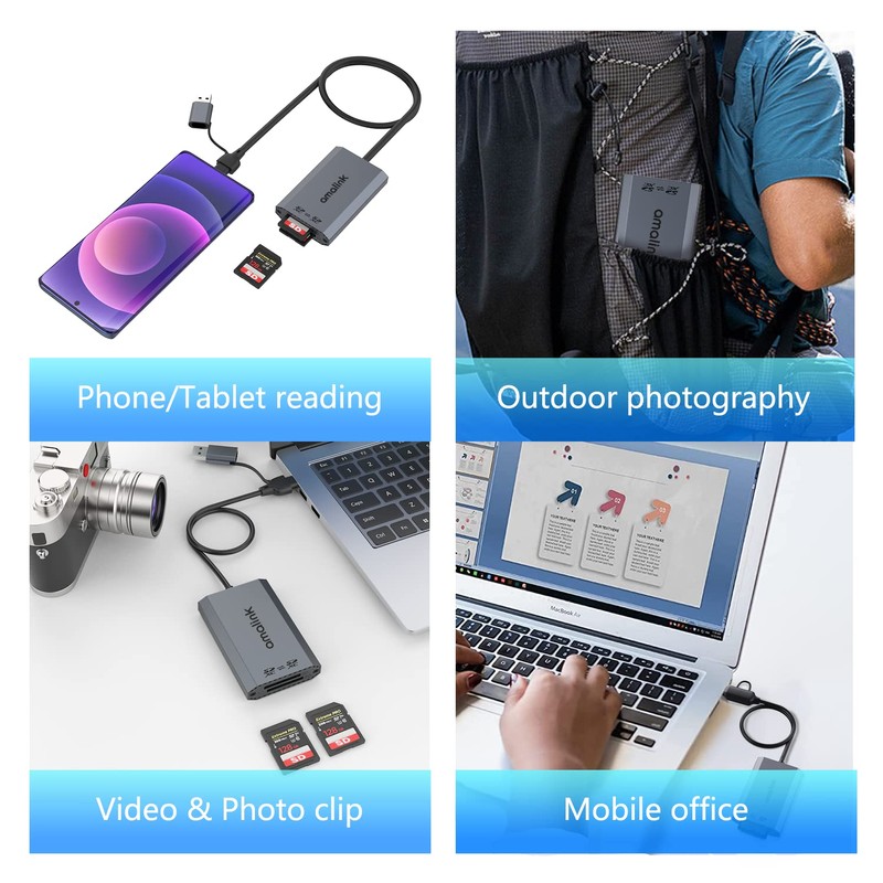 - 【UHS-II Dual SD Card Reader】USB 3.2 Dual SD Card Reader. Compatible with USB-C and USB-A computer, tablet, notebook, or mobile phone.You can transfer photos and videos anywhere, any time.and don't need to switch back and forth between countless card readers, just this one can meet your office needs(need OTG function)
