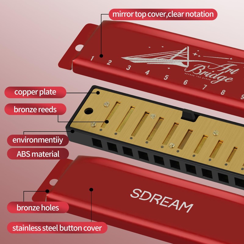 - Exquisite Craftsmanship: Each harmonica undergoes meticulous hand polishing, resulting in a smooth surface that enhances the performer's tactile experience. The electroplated pattern not only adds aesthetic appeal but also ensures the absence of harmful chemicals like formaldehyde, promoting the performer's well-being.