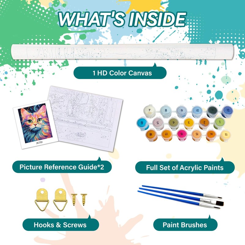 - 【Paint by Numbers Kit】:You will receive cat painting kits for adults:1 High definition canvas,1 Set of acrylic pigments,3 High-quality Paint brushes,2 Hook,1 Color postcard guide,1 Copy of numbered canvas paper for reference