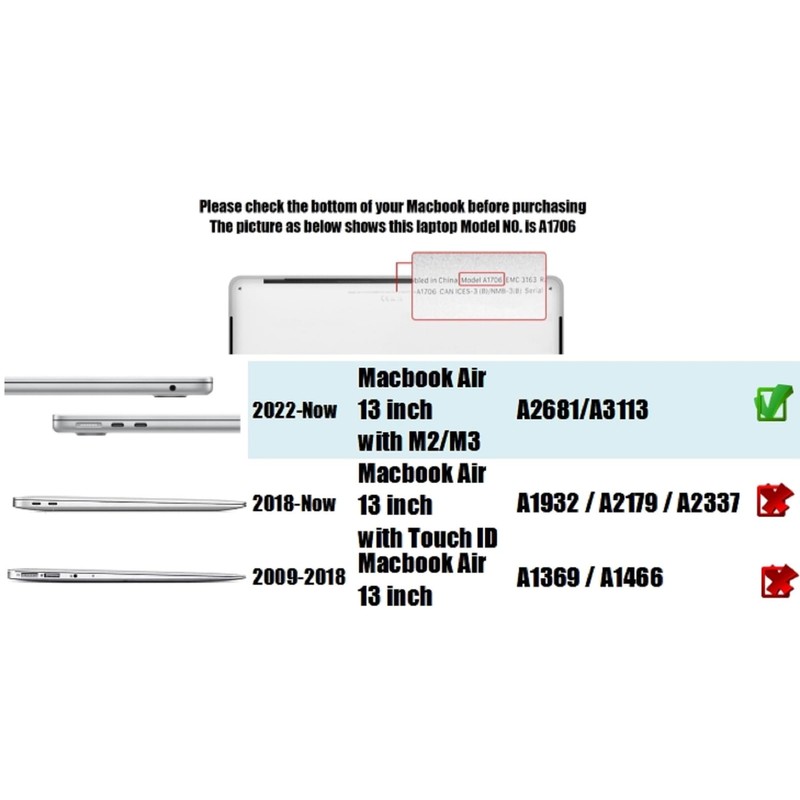 - Only compatible with MacBook Air 13.6-inch Model A2681/A3113 (2022 2023 2024 Version) with M2 M3 Chip. Please double check your laptop's number "A1xxx" on the bottom of the laptop to determine the compatibility.