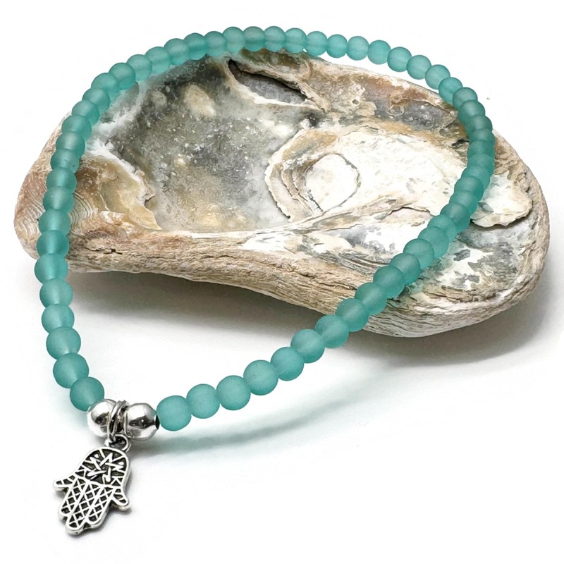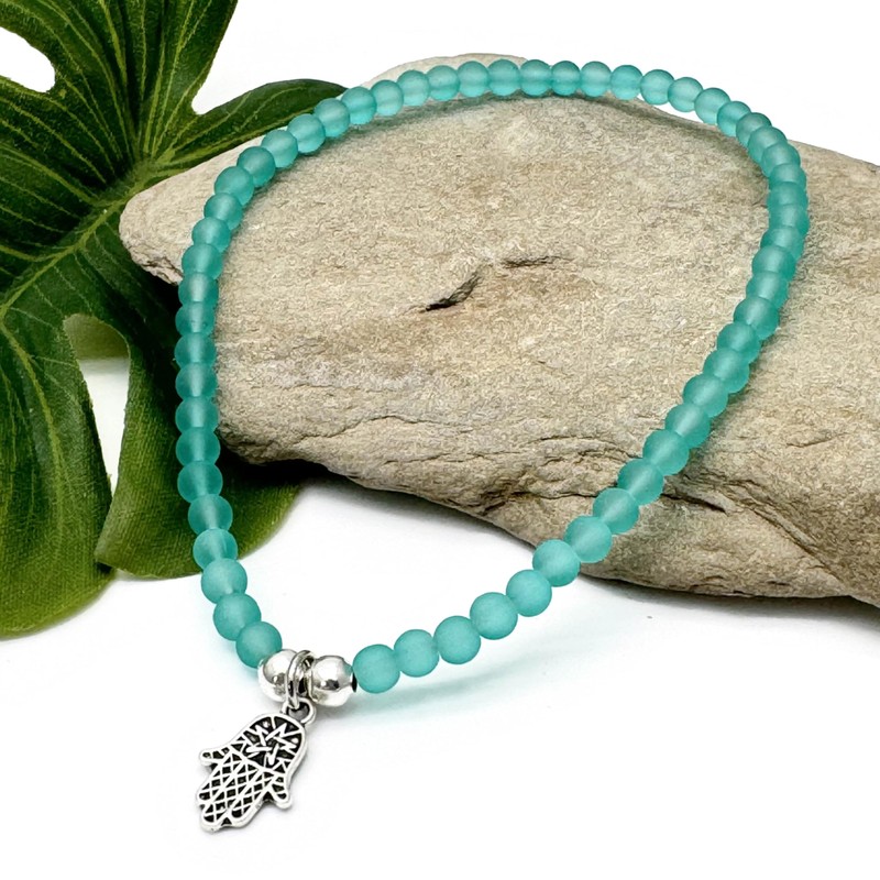 Sea Green Frosted Glass Bead Anklet with Silver Plated Hamsa/Fatima's Hand Charm on Elastic : Small/Medium 9.5 inches