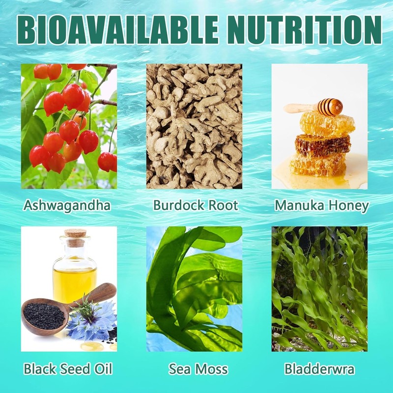 Comprehensive 16-in-1 Formula: Packed with sea moss, black seed oil, ashwagandha, burdock root, and other natural superfoods to boost immunity, improve gut health, and support stress response.