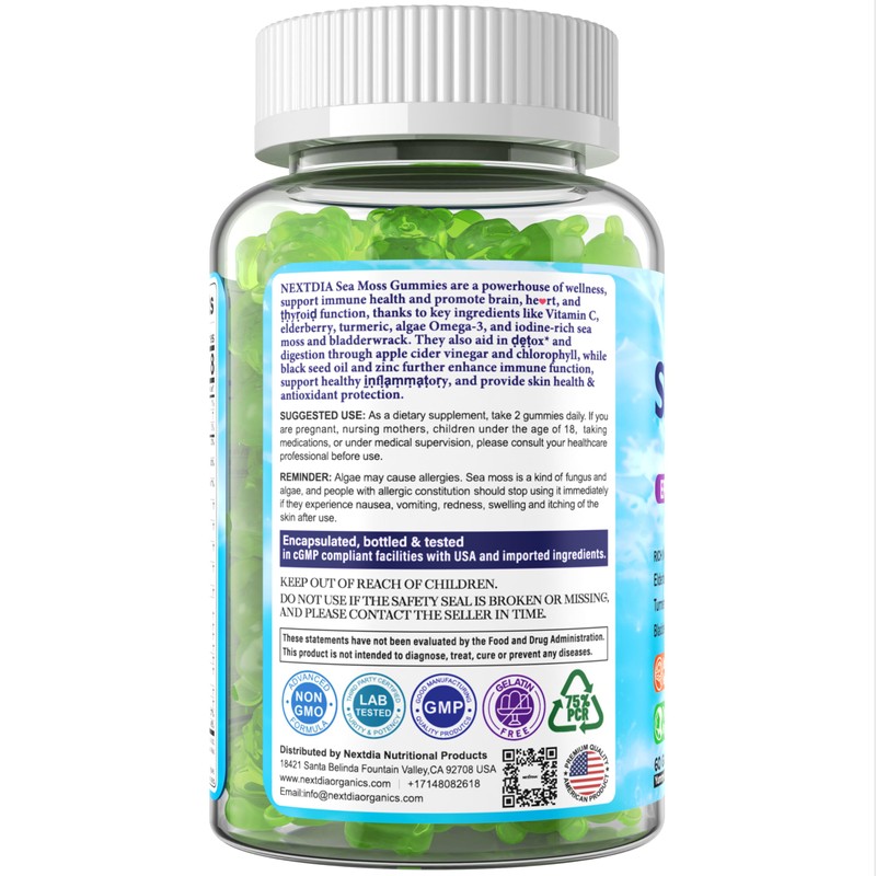 Our Sea Moss Gummies feature a balanced, comprehensive formula combining Sea Moss with essential nutrients like Omega-3, Vitamin C, D3, B12, Iodine, and Zinc. Premium ingredients such as Ashwagandha, Apple Cider Vinegar, Turmeric, Chlorophyll, Black Seed Oil, Elderberry, Burdock Root, and Bladderwrack work together to support immune health, boost energy, promote thyroid and joint health, enhance skin health, detoxify, and aid digestion.