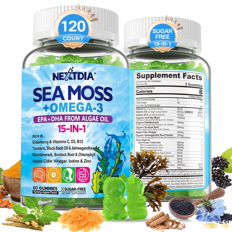 Sea Moss Gummies + Omega-3 Vegan Supplement for Man Women, Organic Irish Seamoss Superfood w/Black Seed Oil, Ashwagandha, Burdock Root, Bladderwrack, B12 for Energy, Brain, Immunity, Sugar Free 120Cts