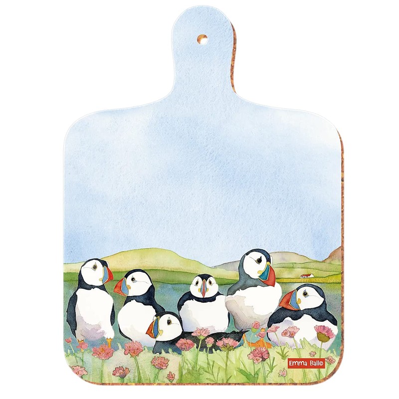 - Pretty EMMA Ball designer mini chopping board with sitting puffin scene with coastal view in the background.
