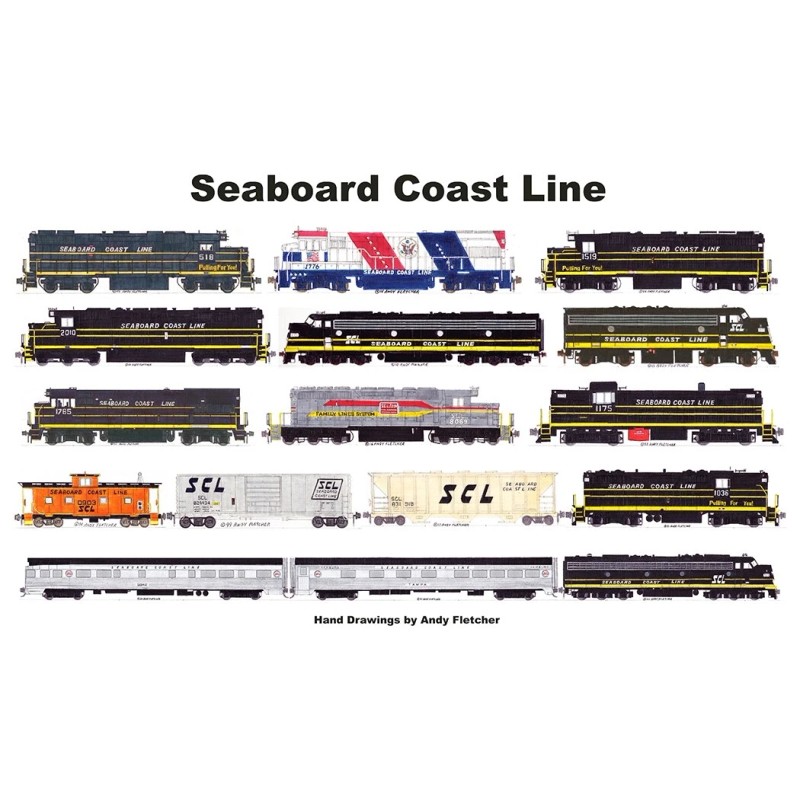 Seaboard Coast Line 11"x17" laminated placemat by Andy Fletcher.  Placemat is a laminated print of Seaboard Coast Line locomotives and rolling stock drawn by artist Andy Fletcher, designer of the Norfolk Southern Heritage Locomotives.  Placemat makes a great table setting for railroad enthusiasts.