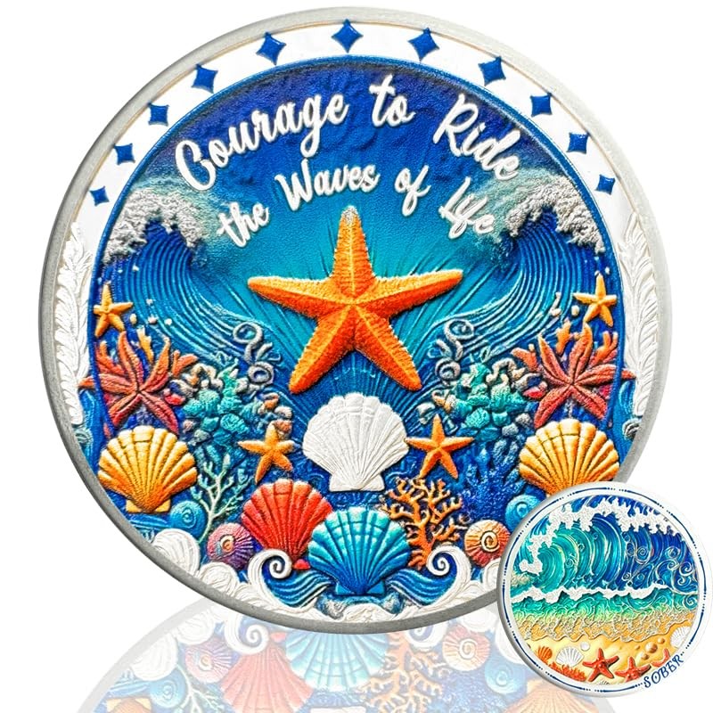 - Elegant Design Front Design: The front side of the aa sobriety coin features a vibrant seafood shell motif with starfish and seashells, symbolizing resilience and growth through the recovery journey. The phrase "Courage to Ride the Waves of Life" encourages strength and positivity in each step forward. Alcoholics Anonymous Chips Back Design: The reverse side displays the iconic Serenity Prayer amidst crashing waves and sandy textures, surrounded by a detailed, ocean-inspired border, offering daily encouragement and peace.