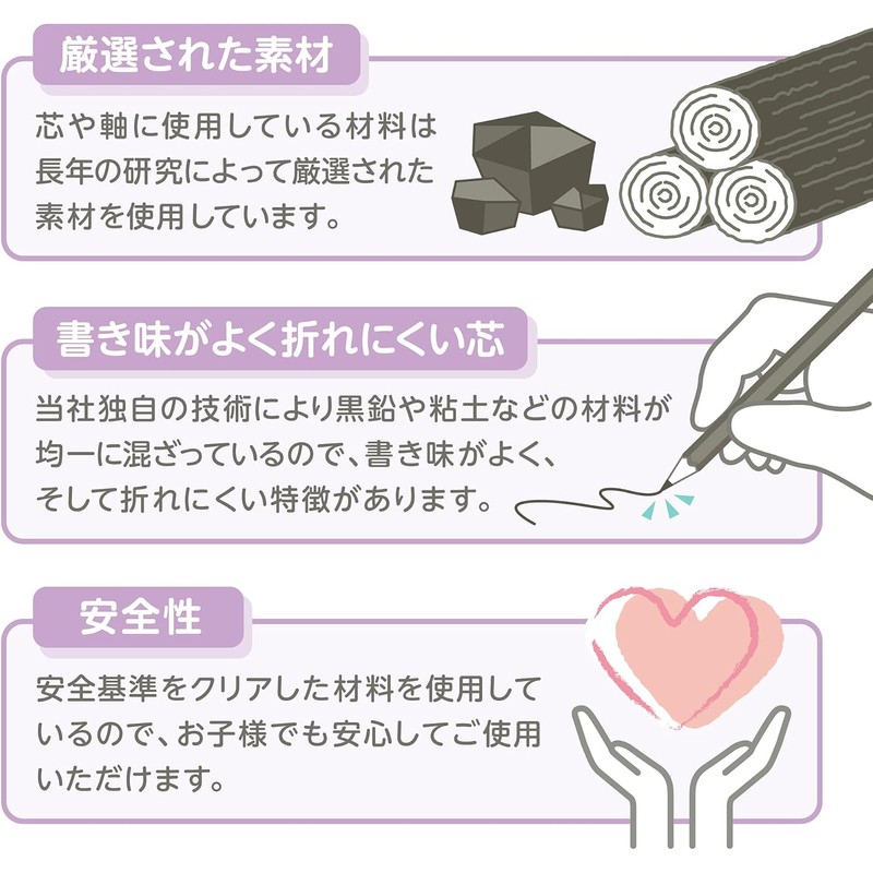 When choosing a pencil, the brand name and hardness indications are all combined in one place in the middle of the dozen box, and the entire axis design is easy to see. We also provide quality information such as the material formulation technology and safety in our pencil production is clearly displayed on the back of the package.