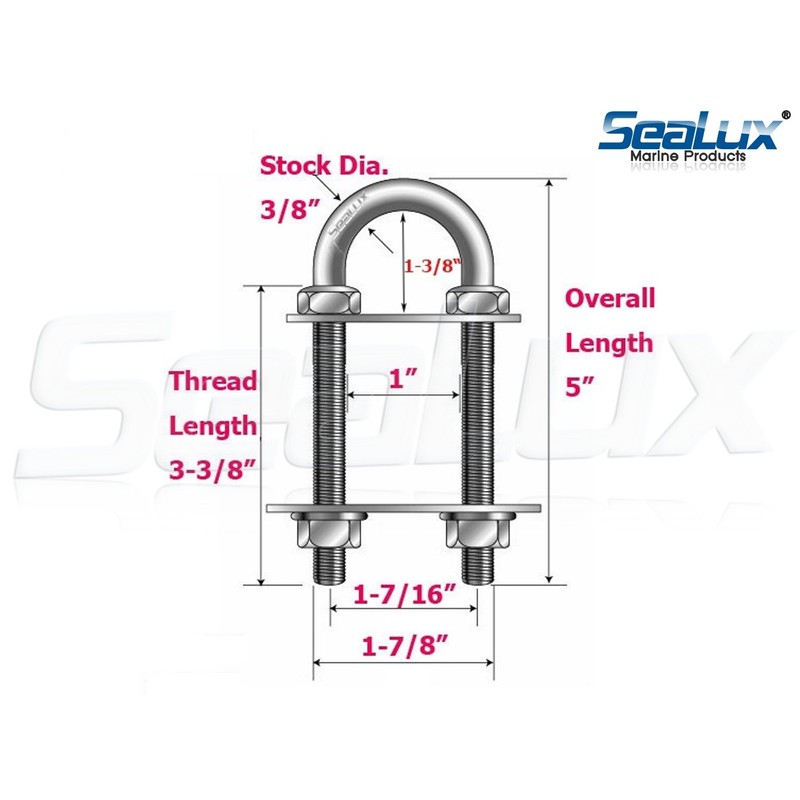 SeaLux Marine Boat Bow Eye Stern Eye U Bolt Tie Down 3/8" Stock, 5" Overall Length, 3-3/8" Thread Length with Hex Nuts and Split washers-SL878805850CW