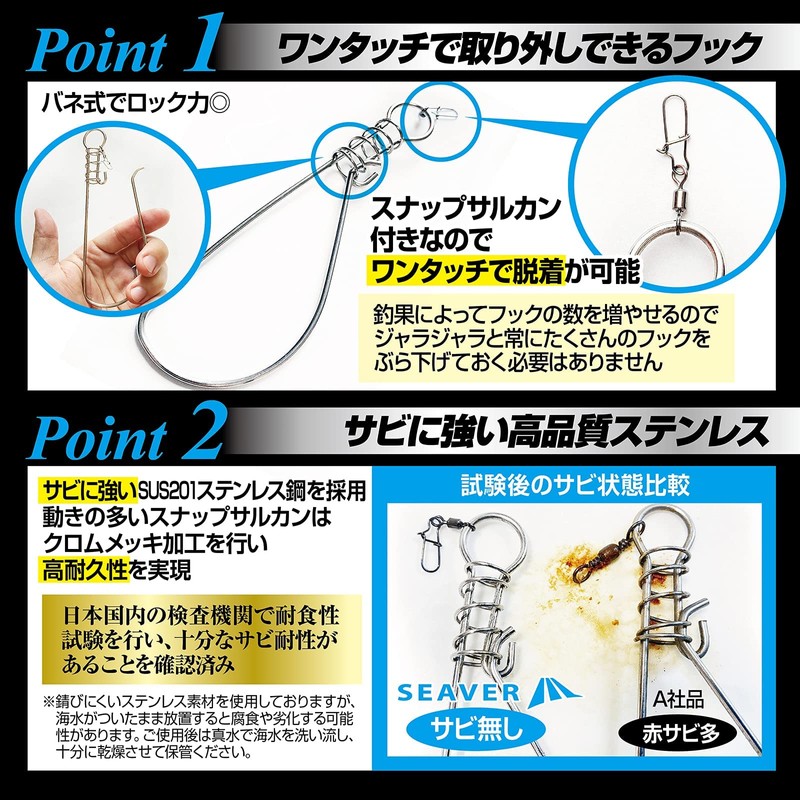 - (Freely attach and detach hooks) Hook with snap swivels allows you to install and remove it with one touch. You can increase or decrease the number of hooks according to your fishing results, so you don't have to hang a lot of hooks at all times. Even if the hooks have become worn, you can use them for a long time