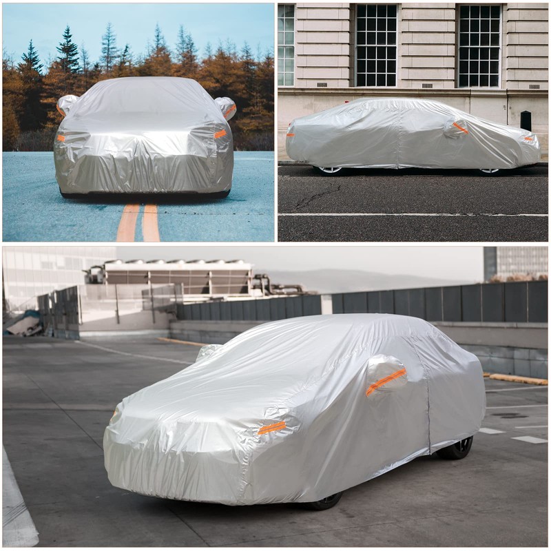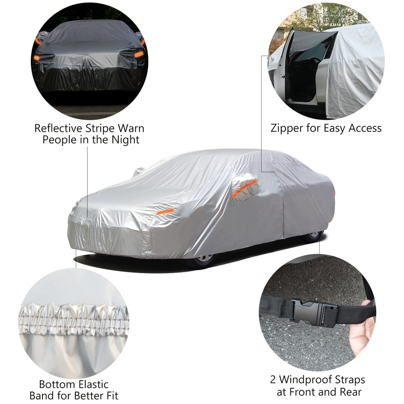 - 【Car Cover Feature】1) Driver door zipper for quick and easy access when you leave something in the car. 2)Double windproof design: the front and rear curled elastic bands to make the car cover fit the body and 2 Windproof straps at front & rear to protect your auto cover by heavy wind. 3) 6pcs full-range reflective stripes warn people in the night. 4) Side mirror covers make the cover fit your vehicle better. 5)A free storage bag with a rope can be easily put cover into the trunk.