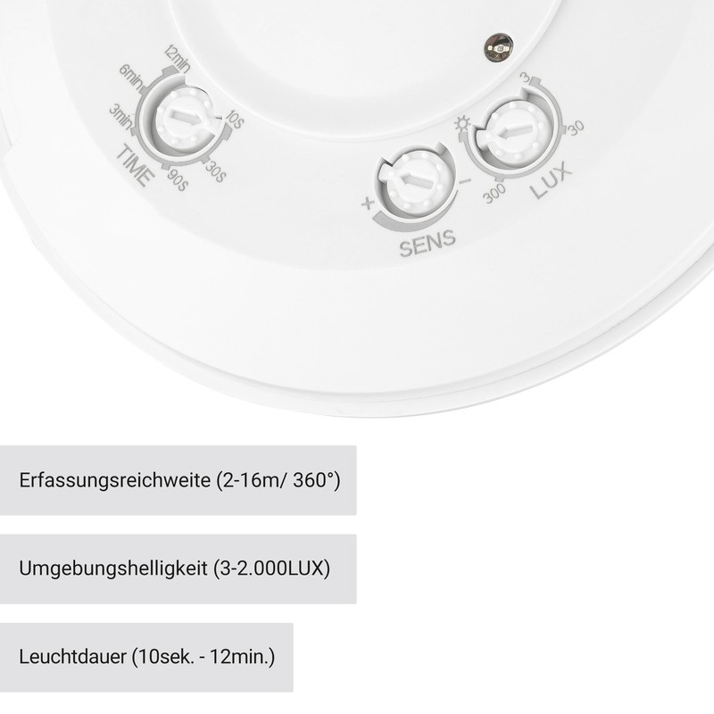 SEBSON® Motion Sensor Indoor Surface-Mounted - Set of 2 - HF Sensor LED Suitable for Ceiling Mounting Programmable Motion Sensor 2-16 m / 360° 3-Wire White