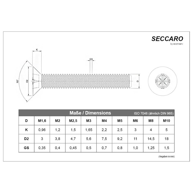 SECCARO Countersunk Screw M4 x 50mm Stainless Steel V2A VA A2 DIN 965 Phillips / PZ Fully Threaded Pack of 20