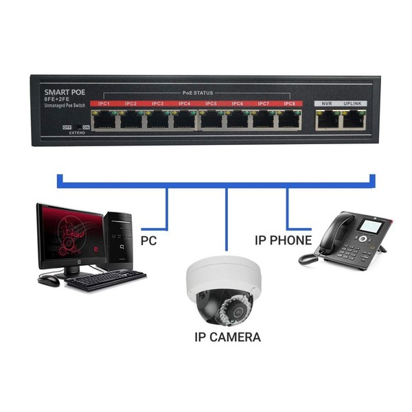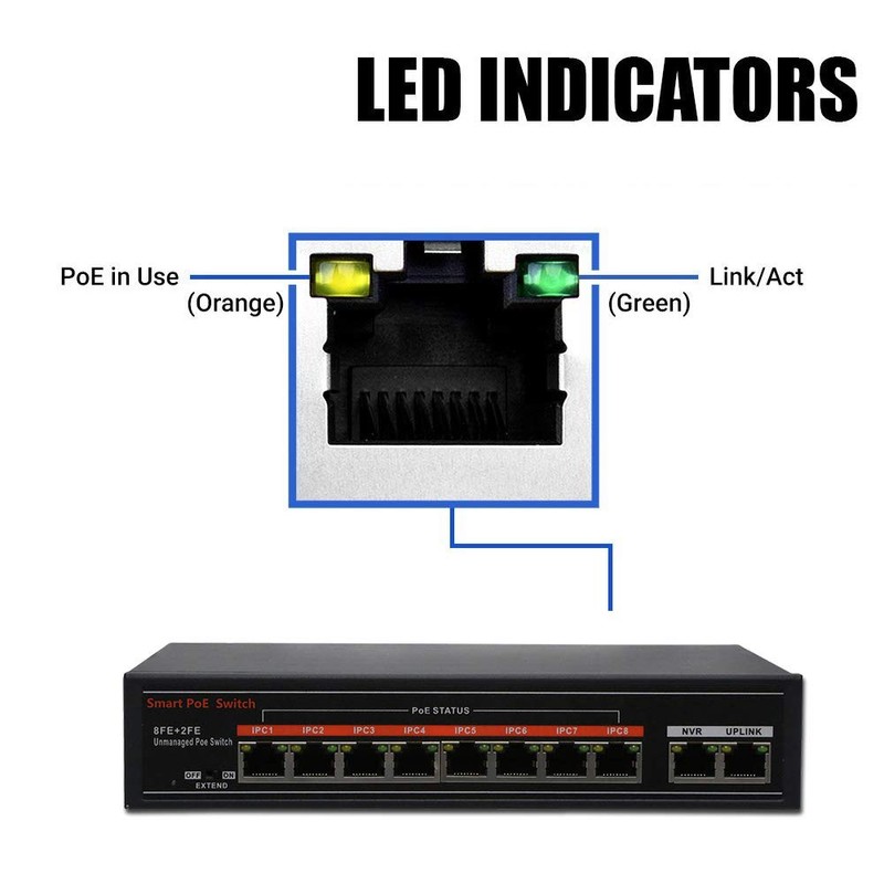 - Uplink Port Design - 8x PoE ports and 2x uplink ports, support 10/100Mbps each. Extra uplink port design enable all PoE ports be used for PoE power devices.