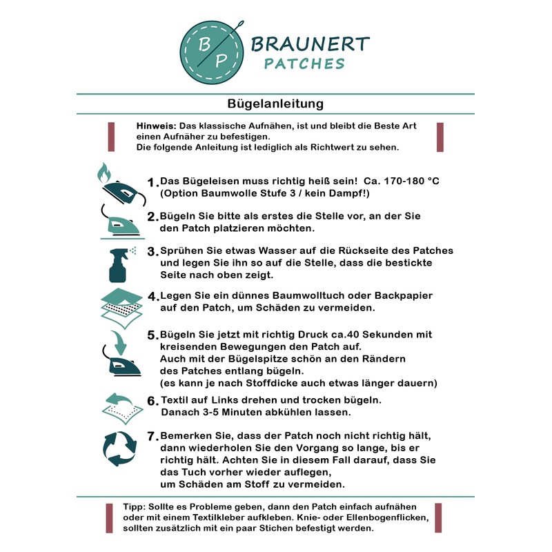 - *** Detailed ironing instructions are included with your order. If you have difficulty ironing, you can also easily sew the patches or attach them with a textile adhesive.