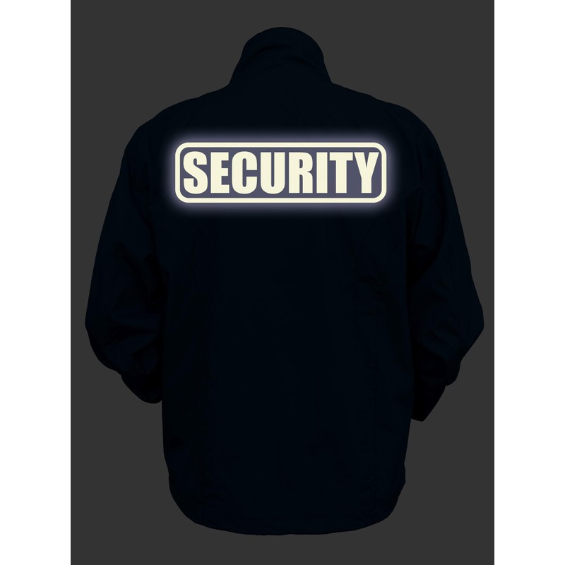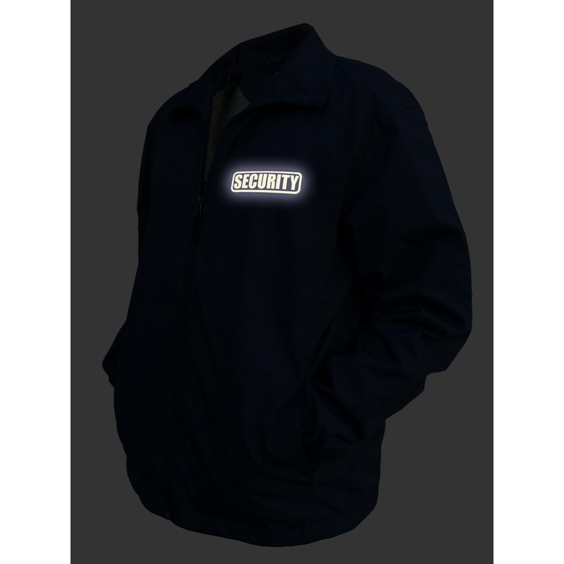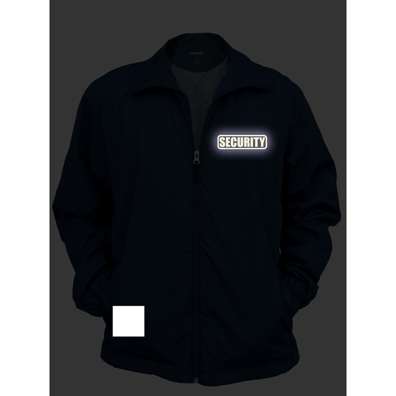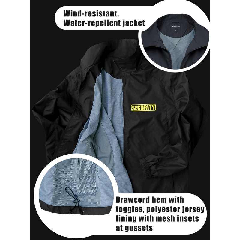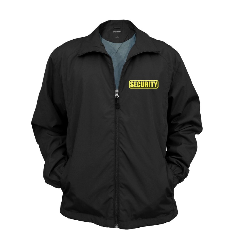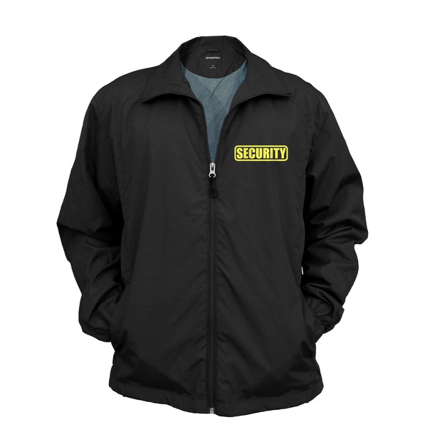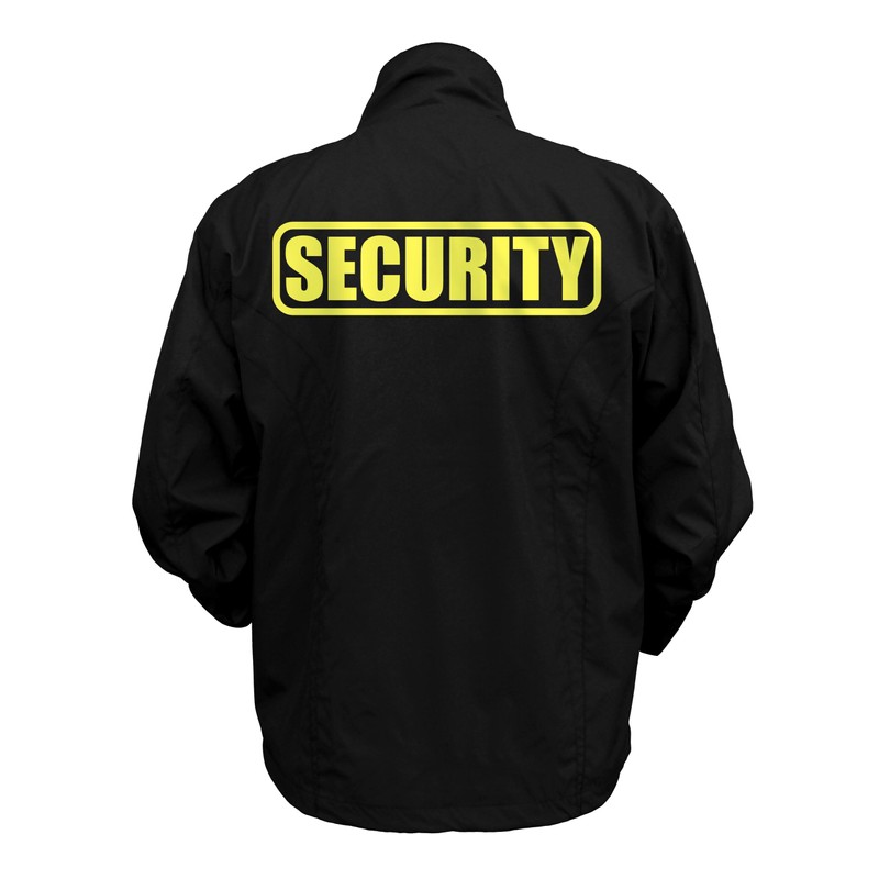 Security Zipped up Windbreaker in Black with Yellow/Reflective Decorations Front and Back
