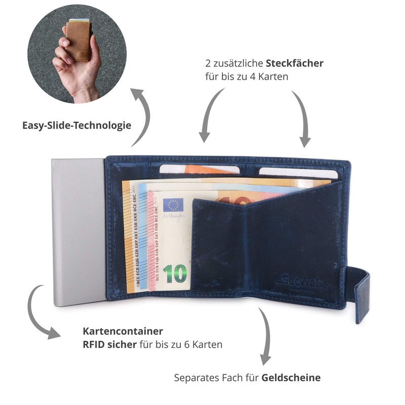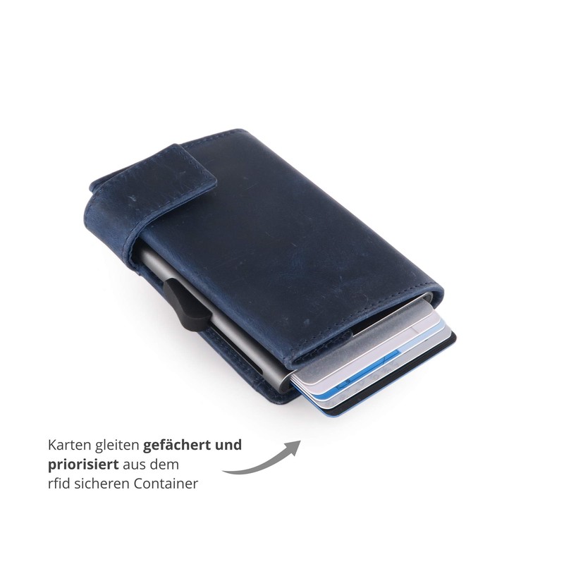 The credit card case with RFID protection combines traditional craftsmanship with innovative Easy-Slide technology. The aluminium container holds up to 8 cards. This guarantees protection against damage and an optimal overview. The elegant case made from the finest leather is available in many different designs, ensures individual elegance and has additional compartments for cards and a banknote compartment on the inside.