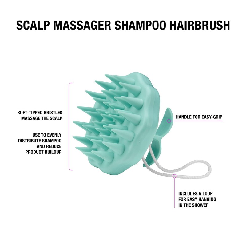 Invigorate your scalp and elevate your shampoo routine with the Conair Handheld Round Scalp Massager Shampoo Brush. This ergonomically designed brush comes in a calming green color, with soft-tipped bristles to gently massage your scalp while evenly distributing shampoo and breaking down product buildup. It's the perfect tool to enhance the health of your hair and scalp right at home.