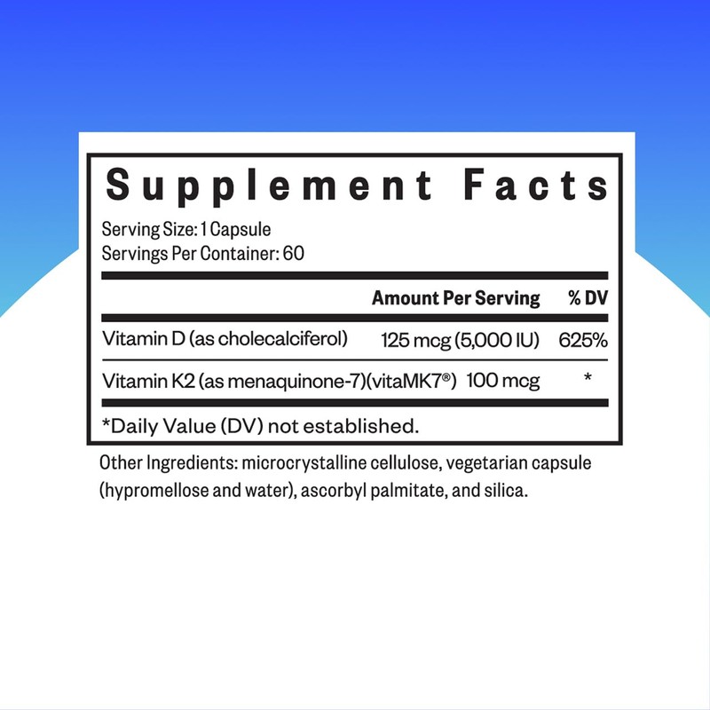 Vitamin D3 + K2 | 5000 IU of D3 (as cholecalciferol) for Optimal Calcium Absorption | 100 mcg of K2 (as menaquinone-7) for Circulatory Health | Supports Bone & Immune Health | 60 Vegetarian Capsules