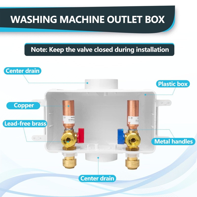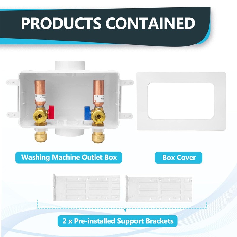 - PACKAGE INCLUDE: 1.washing machine outlet box with a copper water hammer arrestor 2.pre-installed support brackets 3.protective box cover