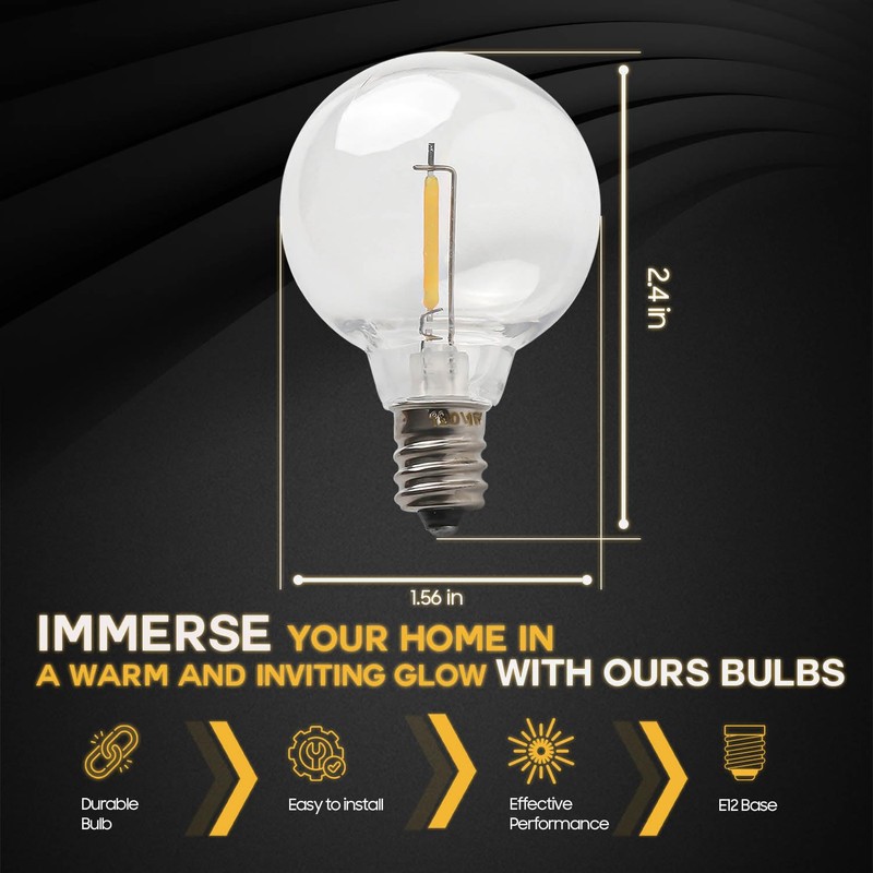 • GLOWING STRING LIGHTS: Bask in the warm glow of bistro lights, party decorations, or festive holiday displays. These bulbs are bright enough to illuminate your space while saving you money on energy bills compared to traditional incandescent bulbs.