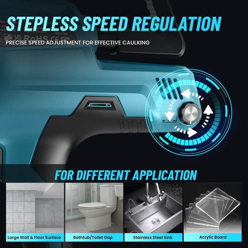 - Stepless Speed Control: The electric caulk gun features stepless speed control, allowing seamless adjustment of the flow rate for precise application across various projects. With a powerful 6500N thrust, it effortlessly handles most adhesives and caulks with ease