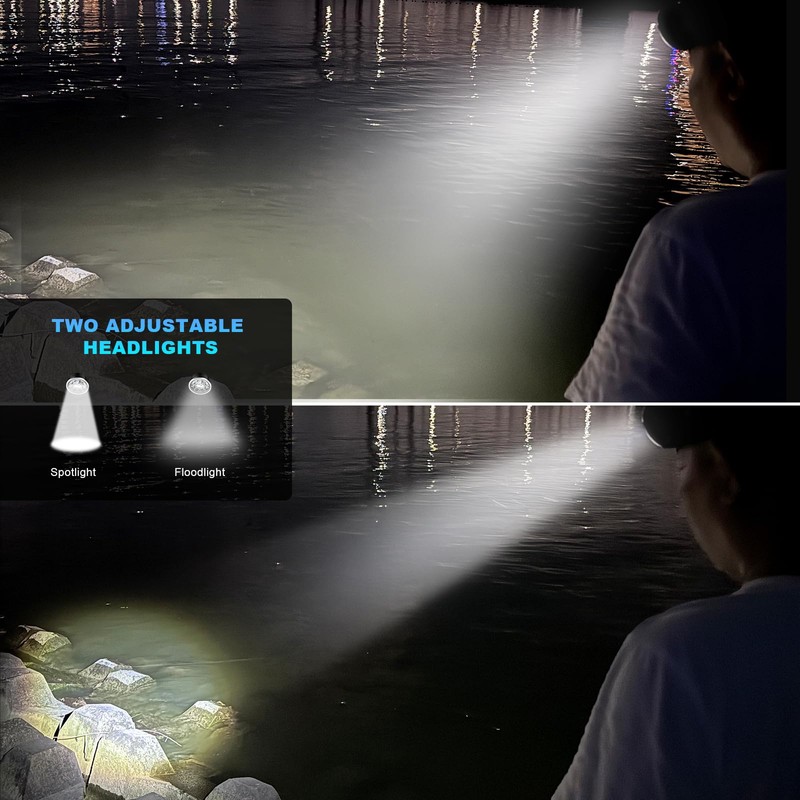 - Double Light Head Lamp: The rechargeable headlamp is designed with two types of lights, the front and the rear. The front light has 10 LED beads and three modes, providing bright lighting. The warm white light of the rear light can be used for maintenance, camping reading, night fishing, etc
