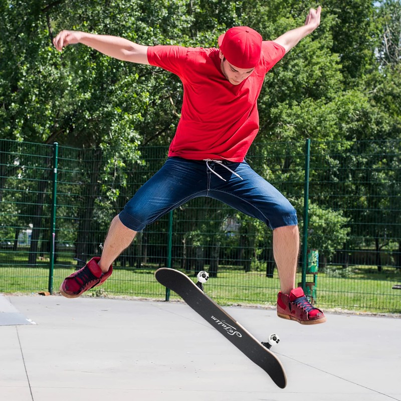 - HIGH QUALITY PRODUCTS ---- The skateboard comes fully assembled with 7 ply maple wooden deck with colored bushings, tough wheels, ultra smooth bearings, all aluminum metal trucks, and shock pads
