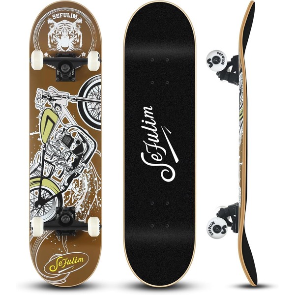 Sefulim 31 x 8 Inch Complete Skateboard 7 Layer Canadian Maple Double Kick Deck Concave Cruiser Trick Skateboard for Boys Girls Teens Adults Beginner