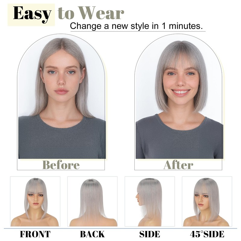 SEGO Grey Hair Toppers for Women Real Human Hair With Bangs, 10 * 12 CM Silk Base Clip In Topper Wiglet, Top Pieces for Women with Thinning Hair -6 Inch #G1 Silver Grey