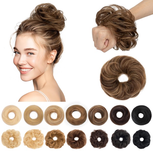 SEGO Human Hair Messy Bun Hairpiece Real Scrunchies Wavy Curly Tousled Updo Donut Chignon Ponytail Extensions for Women Girls-#2RP6R Dark Brown & Light Brown