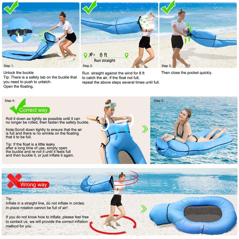 - NO PUMP REQUIRED, EASY TO INFLATE: Open wide this swim pool float, RUN IN A STRAIGHT LINE (not a circle) to catch air. Close the pocket quickly, roll it down as tight as you can so all the air squishes, then snap the buckle together. Even you can inflate it simply by a FAN while indoor! Tips: There is a safety tab on the buckle that you need to push to unlatch.