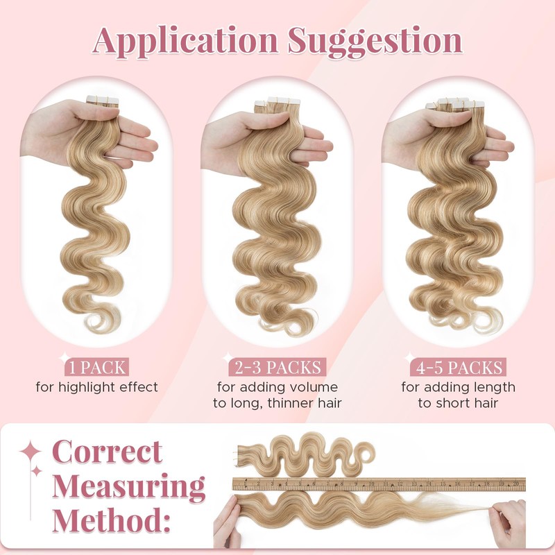 - Easy Care: Extend lifespan with sulfate-free shampoo, weekly conditioning, and essence oil on ends. Safely remove with remover for tape in hair extensions human hair reuse. Avoid heat >350°F to protect body wave hair extensions texture.