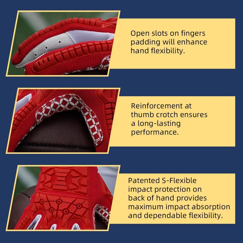 Seibertron Lineman 2.0 Padded Palm Football Receiver Gloves, Flexible TPR Impact Protection Back of Hand Glove Adult Sizes Red L