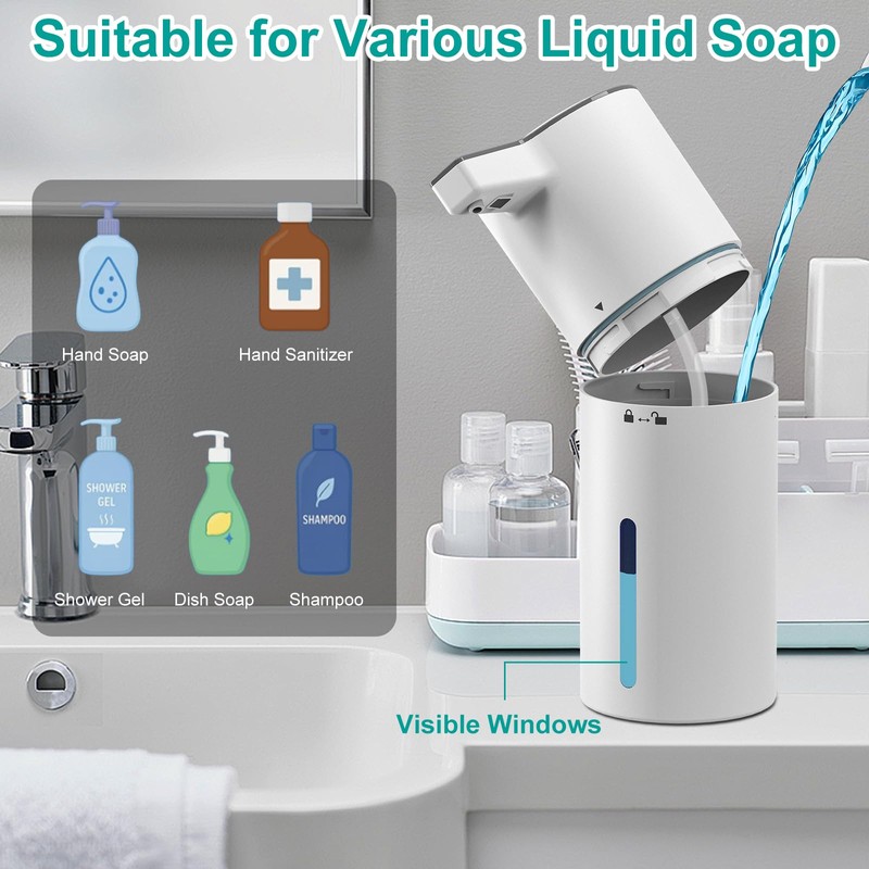- 【400 ml großes Fassungsvermögen & universelle Kompatibilität】 Dieser berührungslose Seifenspender hat ein Fassungsvermögen von bis zu 400 ml und ein Sichtfenster zur einfachen Kontrolle, sodass häufiges Nachfüllen entfällt. Er bietet Platz für eine Vielzahl von Seifen, darunter Spülmittel, Duschgel, Shampoo, Handdesinfektionsmittel und Gesichtsreiniger. Geeignet für verschiedene Umgebungen wie Bad, Küche, Büro, Hotel, Zuhause, Schule und Restaurant.
