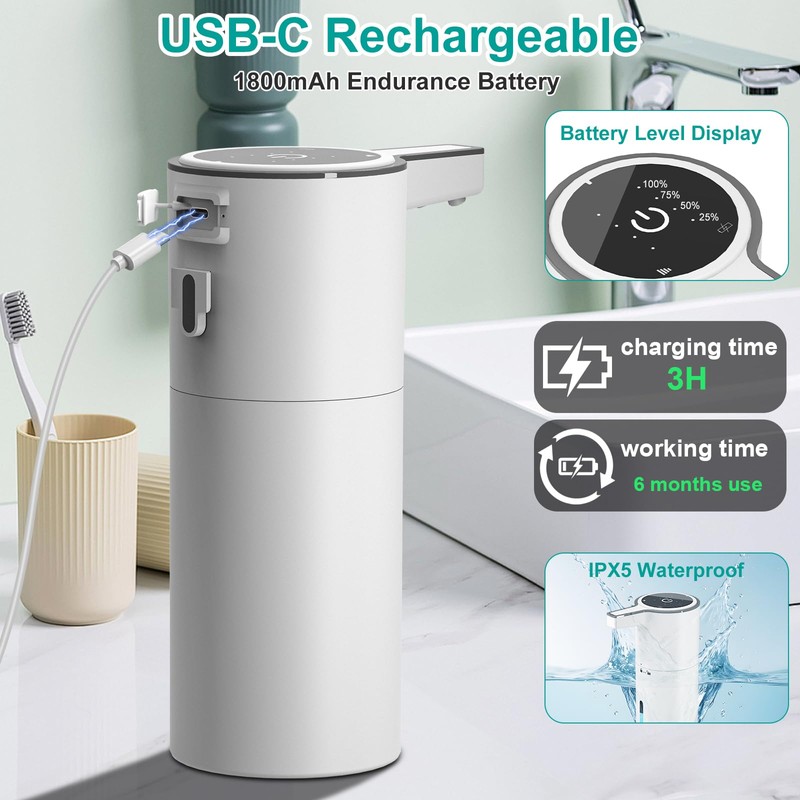 - 【Langlebiger 1800-mAh-Akku & USB-C-Schnellladefunktion】 Der Flüssigseifenspender ist mit einem integrierten 1800-mAh-Akku ausgestattet, der bis zu 6000 Anwendungen pro Ladung ermöglicht. Die vollständige Aufladung per USB-C-Schnellladefunktion dauert nur 3 Stunden und gewährleistet so eine lang anhaltende Leistung ohne häufigen Batteriewechsel.