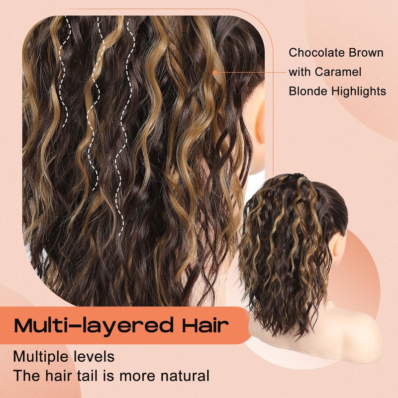 SEIKEA Ponytail Extension, 14" Short Wavy Drawstring Ponytail Lightweight Multi Layered Fake Pony Tails Hair Extensions Clip in Hair Extensions Ponytail Chocolate Brown with Caramel Blonde Highlights