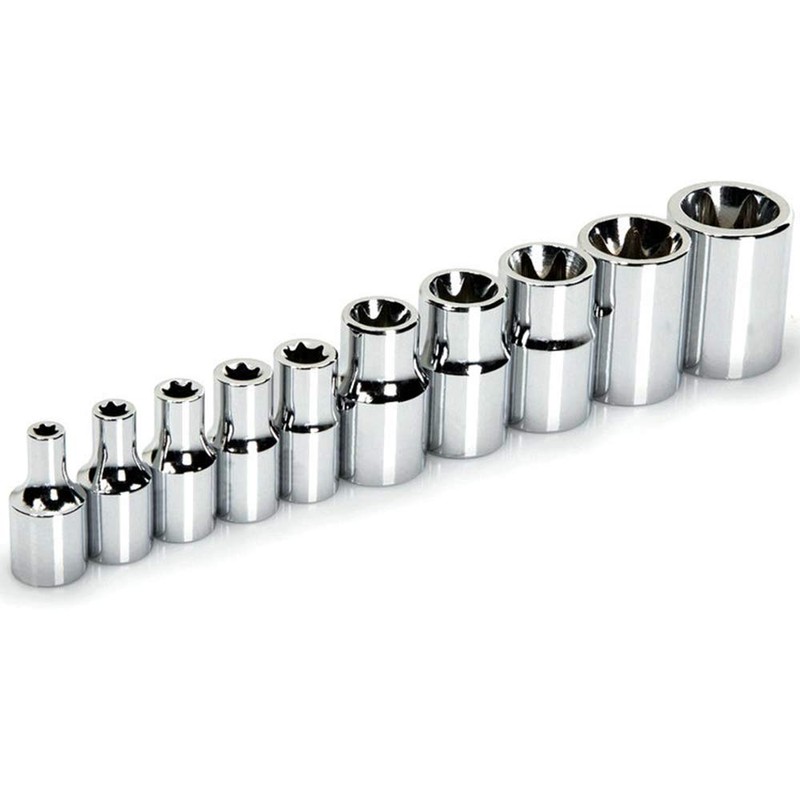 - Five 1/4" sockets E4, E5, E6, E7, E8, and five 3/8" sockets E10, E12, E14, E16, E18
