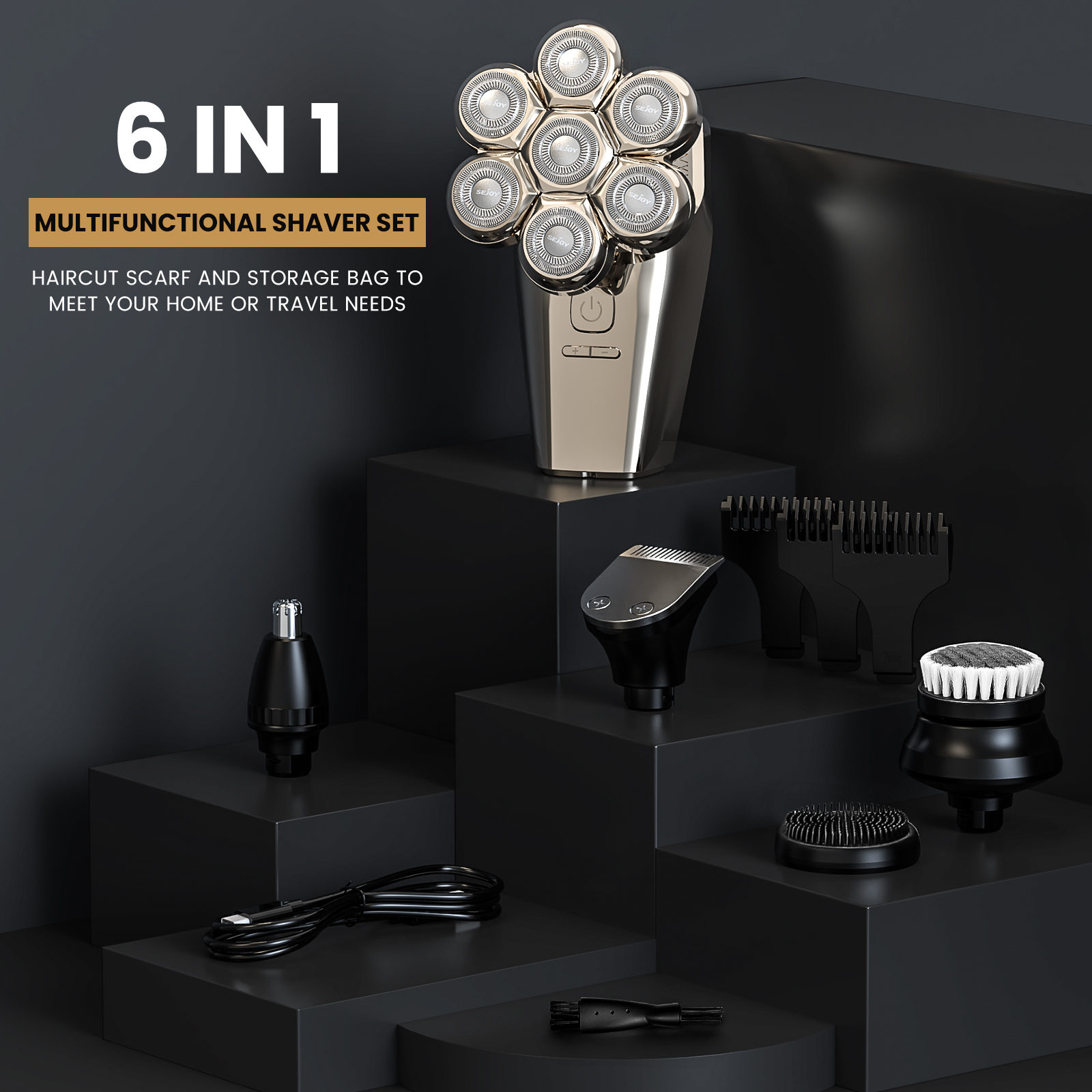SEJOY 5in1 Rotary Electric Shaver Rechargeable Bald Head Hair Beard Trimmer Kit