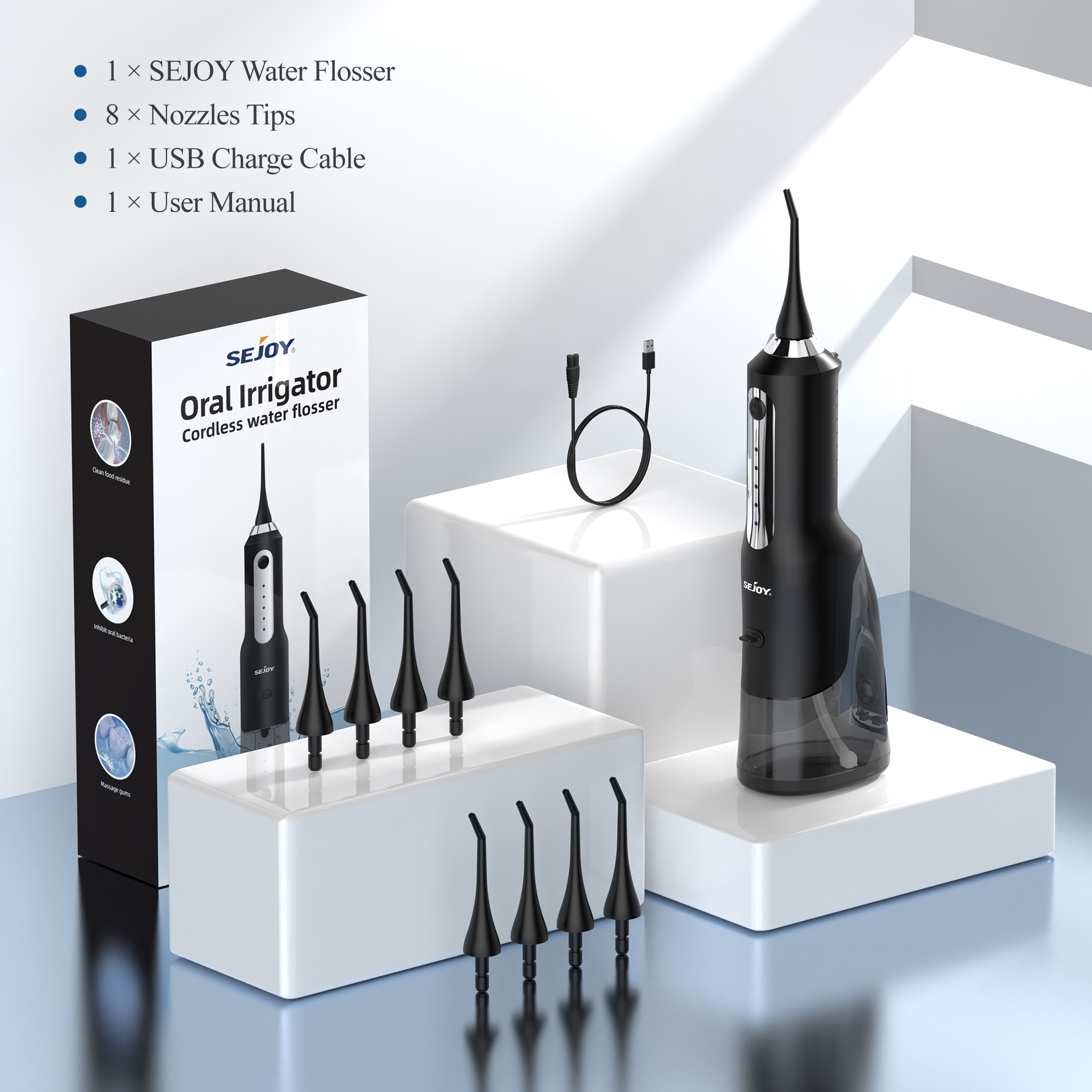 SEJOY Water Flosser Cordless Dental Oral Irrigator Teeth Cleaner Floss 8 Jet Tip Black