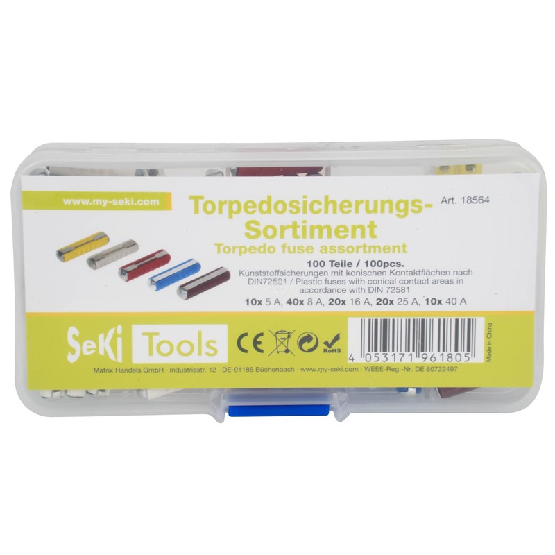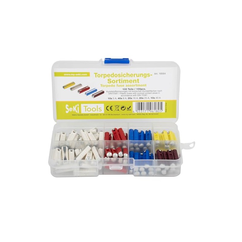 SeKi 100 Piece Torpedo Fuse Assortment; 10x5A, 40x8A, 20x16A, 20x25A, 10x40A; Safety Fuse