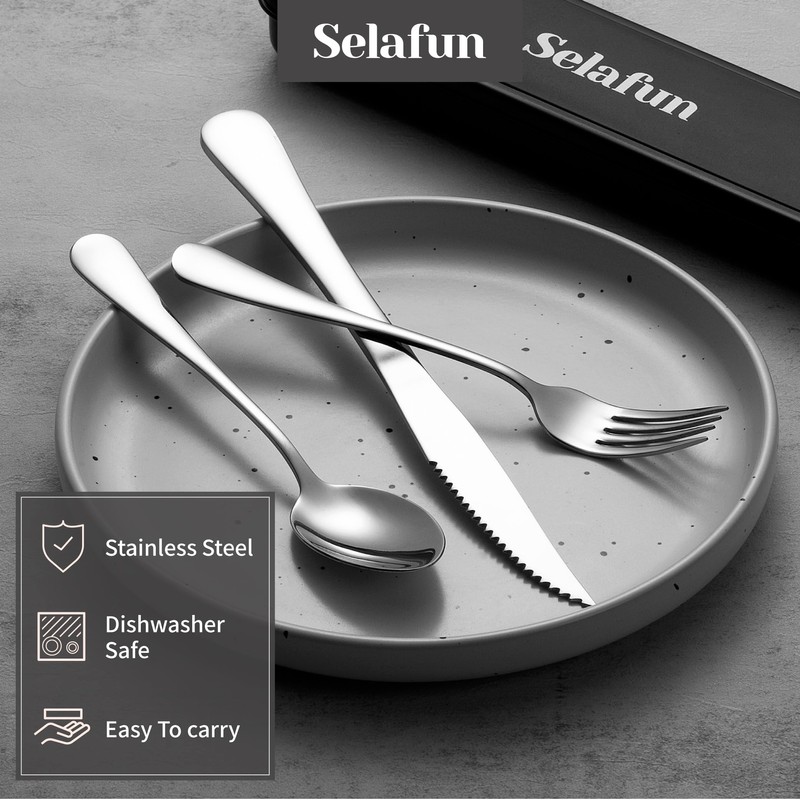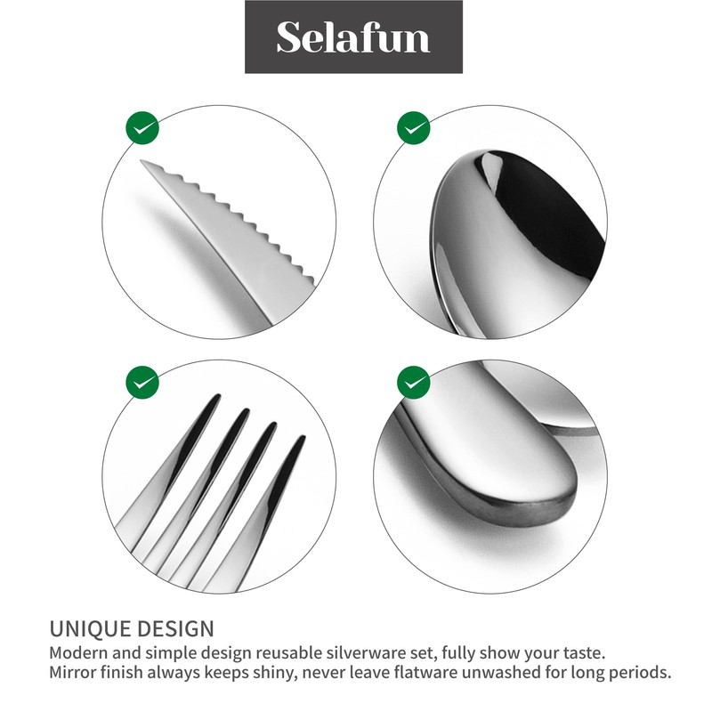 - UNIQUE DESIGN - Modern and simple mirror design reusable silverware set, fully show your taste. Mirror finish always keeps shiny, never leave flatware unwashed for long periods.